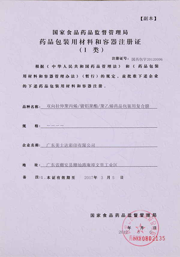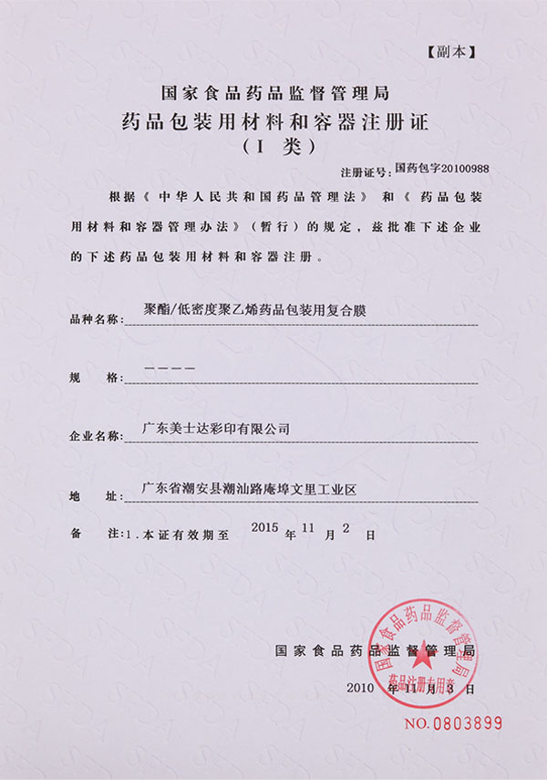 药品包装用材料和容器注册证